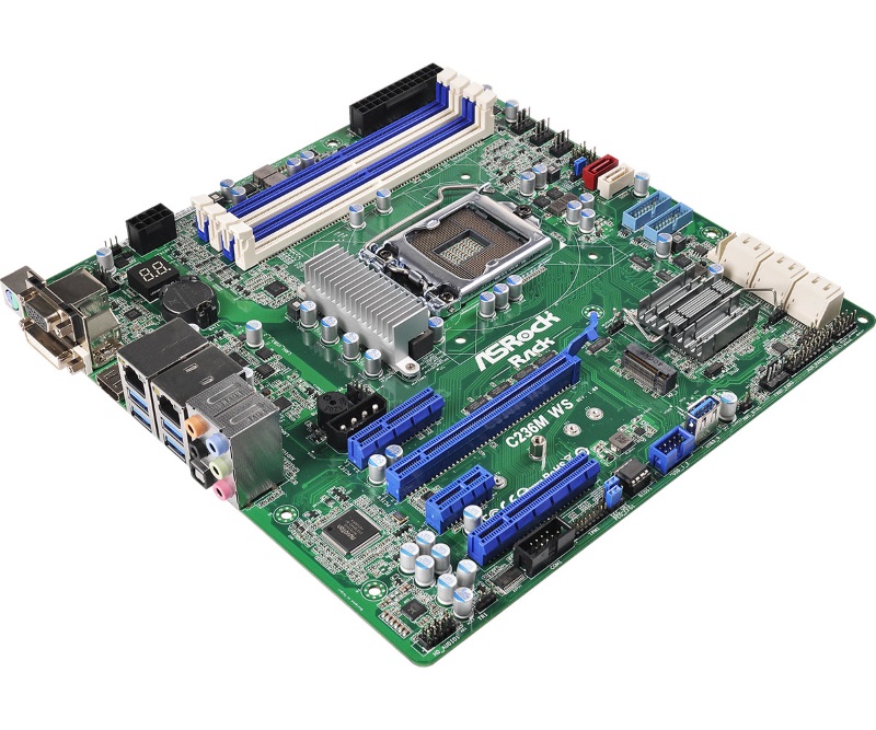 El C236 WS es el modelo completo ATX, dando apoyo a los compañeros de procesadores de doble PCIe en PCIe 3.0 x8/x8, redes doble de Intel (I210 y I219), otra ranura PCIe x4 3.0 del chipset, un total de ocho puertos SATA con SATA Express también, un puerto integrado USB 3.0 Tipo-A y ocho puertos 3.0 a través de dos cabeceras y cuatro puertos en el panel trasero USB.