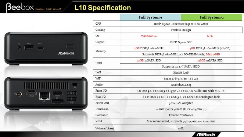 Esta mini-Pc tendrá dos variantes, uno con Windows 8.1 o Windos 10, 1x2GB de DDR3L-1600 y 32GB mSATA SSD, y otro sin sistema operativo, pero con 2x2GB de DDR3L-1600 y 128GB mSATA SSD. También habrá un chasis barebones para los usuarios que tengan que suministrar su propia DRAM y almacenamiento.
