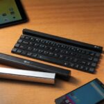 Dos pequeños brazos de plástico se doblan hacia fuera del extremo del teclado para así apoyar una tableta o un teléfono inteligente, y puede alternar entre dos dispositivos diferentes conectados con Bluetooth a la vez. L duración de la batería es de tres meses con una sola batería AAA.
