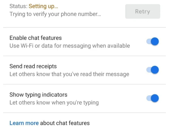Una vez realizado los pasos antes mencionados, ingresa en la app Messages y seleccionas los tres puntos ubicados en la esquina superior derecha, luego selecciona en Ajustes. Te vas a donde dice “Funciones de Chat” y colocas tu número telefónico. Llegado a este punto tendrás que estar pendiente del Status que debería pasar de “instalando” a “conectado”.